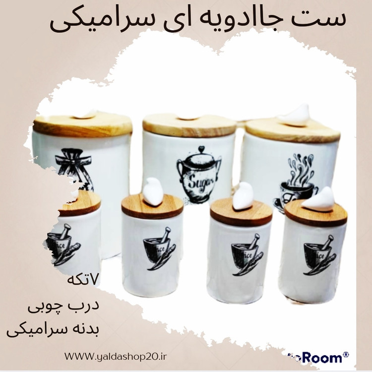این محصول ۷تکه بوده جنس بدنه جاادویه ای از سرامیک و درب چوبی و ۳عدد بزرگ و۴عدد کوچک مناسب برای اودیه ،قندوشکر ،،،،می باشد