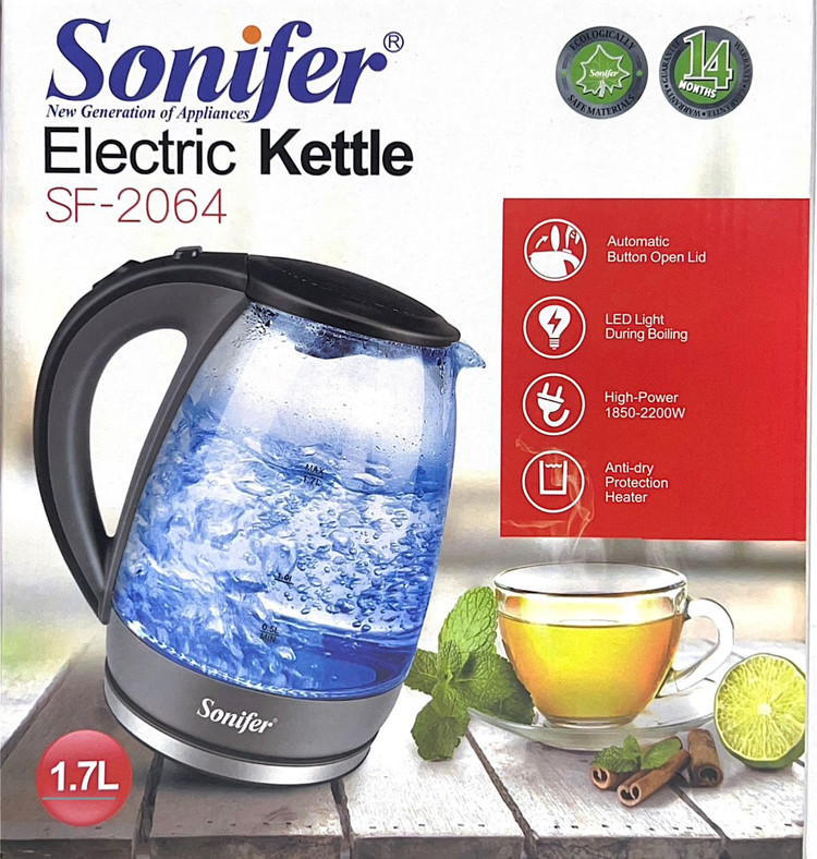 کتری برقی شیشه ای برند سونیفر کد 2064 مخزن ۱.۷لیتر