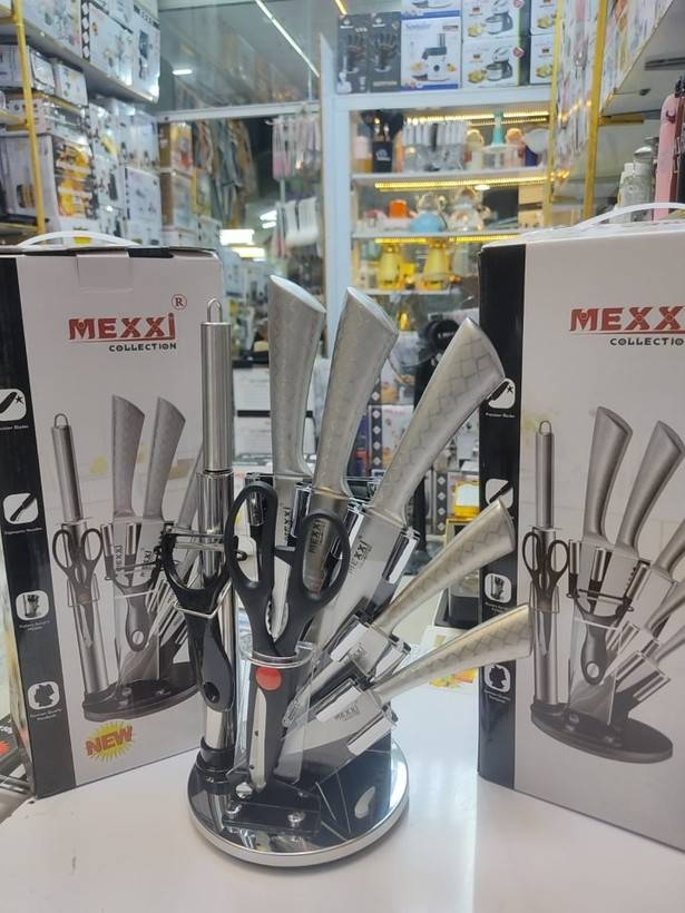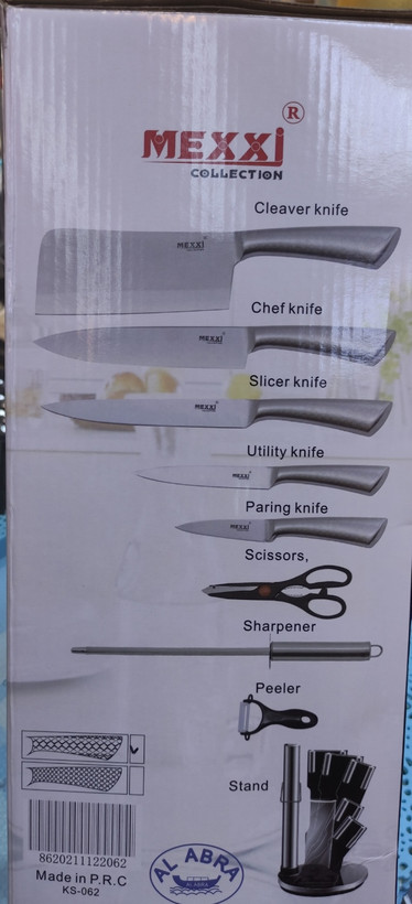 این محصول از مجموعه محصولات برندمکسی دارای چهار عدد چاقو یک عدد سوحان یک عدد قیچی یک عدد پوست کن وساتور ودارایه استند ایستاده نقره ای مشکی میباشد